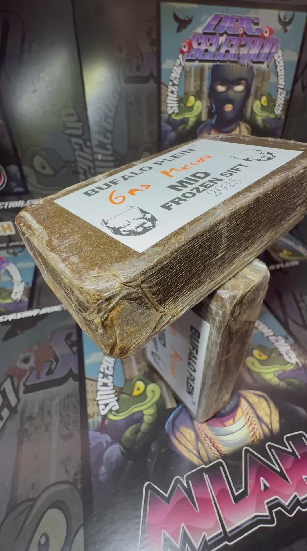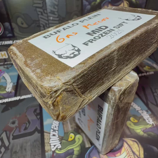 Questa versione mid del Frozen Sift Bufalo Plein, ricavata dallo strain Gas Melon (Gelato × Watermelon Zkittlez), è ottenuta tramite setacciatura a freddo con filtri da 160 e 120 micron, per una polvere fine ma leggermente più corposa rispetto alla fascia top.